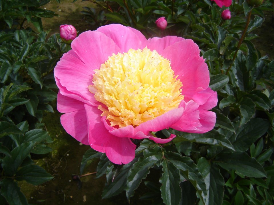 Peony 'Bowl of Beauty' is a striking herbaceous variety known for its large, semi-double flowers with a unique two-tone effect. The outer petals are a vibrant rose-pink, elegantly surrounding a centre of soft, creamy-yellow petaloids. Flowering in late spring to early summer, this peony is highly floriferous and lightly fragrant. Strong stems support the showy flowers, making it an excellent choice for both garden display and cut arrangements. The deep green foliage remains attractive throughout the season, adding texture and contrast.
