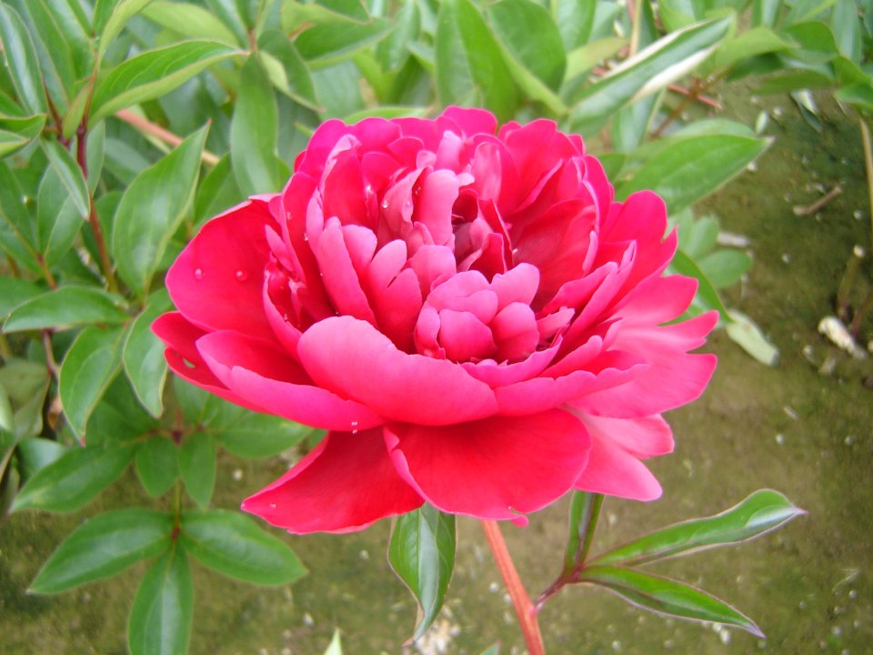 Peony 'Paul M. Wild' is a striking herbaceous variety known for its large, fully double, deep crimson-red flowers. The velvety, ruffled petals form a rich, rounded flower that retains its vibrant colour throughout the flowering season. Flowering in late spring to early summer, this vigorous peony has strong stems that support its impressive flowers, making it an excellent choice for both garden display and cut arrangements. The lush, dark green foliage provides a beautiful contrast, adding lasting interest to borders and garden beds.